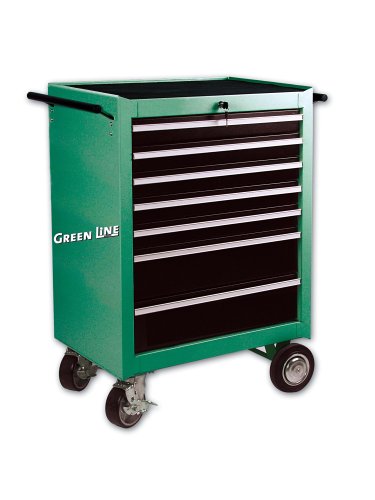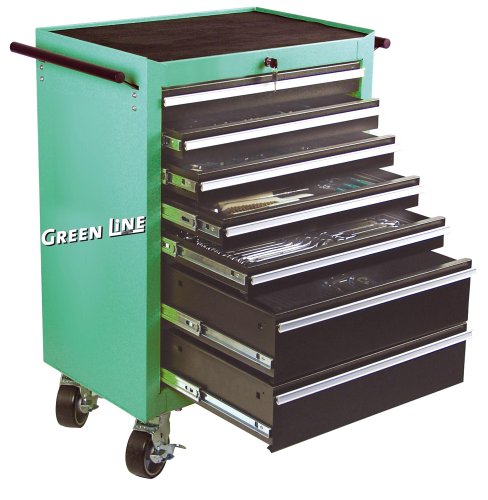 * Funktionen und Ausstattung: solide Stahlblechkonstruktion grün pulverbeschichtet; große Arbeitsablage mit Anti-Slip Auflage; 7 abschließbare Schubladen auf hochbelastbaren, kugelgelagerten Gleitschienen mit Auszugsstop; Stabile kugelgelagerte Qualitätsrollen: 2 x starr, 2 x lenkbar mit Feststellbremse