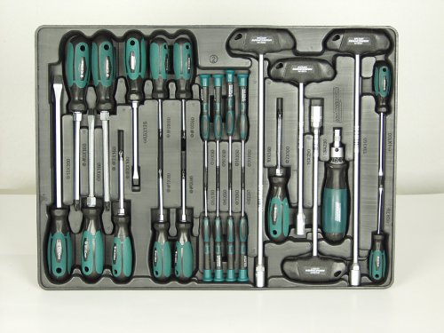 * Bestückung: Schubkasten 1: Knarre 72 Feinzahnknarre 1/2″+1/4″, 13xSteckschlüsseleinsätze 1/4″ und 8×1/4″ lang, 17xBits ¼“ (3xFlach, 2xPhilips, 2xPozidrive, 6xT-Profil, 4xInnensechskant), Flexible Verlängerung 1/4″, 2×1/2″ Verlängerung 50+100 mm, 18xSteckschlüsseleinsätze 1/2″ und 4x½“ lang, 2xZündkerzeneinsätze 1/2″, 15xBits 1/2″ (4xInnensechskant, 3xFlac,. 2xPhilips, 2xPozidrive, 4xT-Profil), Bitadapter, Kardangelenk, 2xVerlängerung 1/2″, Stiftschlüsselsatz 3 tlg., 1xUniversal Magnetbithalter; 1xQuick Magnetbithalter, 13 Bits Länge 90mm, 98 Bits Länge 25mm; Schubkasten 2: Metallsägebogen 300mm, Flachmeissel 200+250mm, Fühlerlehren 0.05-1.00mm, Stahldrahtbürste 3-reihig, Splintentreiber 3/4/5/6/8/10 mm, Bandmass 5m, Rollgabelschlüssel 150/200/250 mm, Schlosserhammer 300g & 500g, Schieblehre 160mm; Schubkasten 3: Elektronik-Seitenschneider, Seitenschneider, Elektronik-Vornschneider, Elektronik-Kombizange, Kombizange, Aussensicherung gebogen, Elektronik-Spitzzange gebogen & gerade, Abisolierzange, S