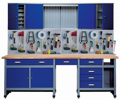 Küpper Werkstatt-Set, ultramarinblau, made in Germany, bestehend aus Küpper Werkbank 12287, B. 240 cm x H. 84 cm x T. 60 cm, ultramarinblau-silber, 5 Schubladen H. 12 cm, 1 breite Schublade H. 12 cm, 2 verschließbare Türen, Sitzraum, Schubladen mit Führungsrollen, Arbeitsplatte aus massiven Buchenholz in 30 mm Stärke (stabverleimt), Küpper Hängeschrank 70187, B. 240 cm x H. 60 cm x T. 19 cm, 4 verschließbare Türen, 4 Fachböden, 36 Sichtboxen, 1 Lichtblende für Neonröhre, 2xLochwand 3tlg. 70100(inkl. 12 Standard-Haken), zerlegt, 5 Jahre Garantie, sparen Sie gegenüber dem Einzelkauf!