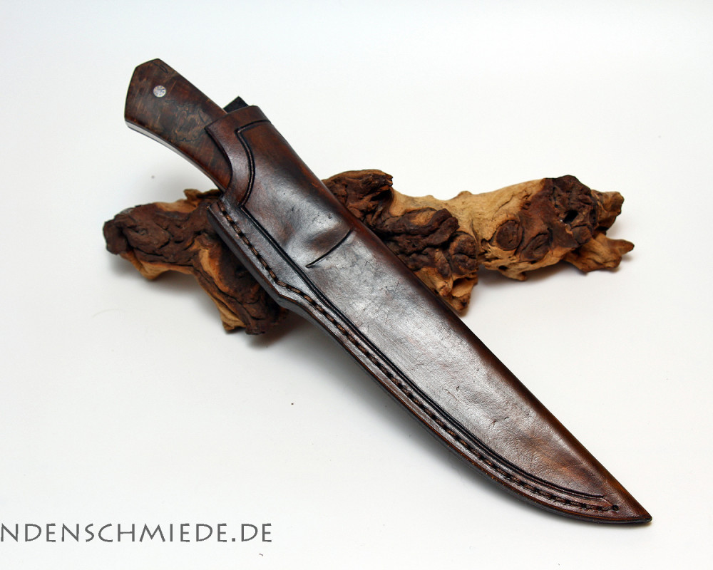 Mit den Griffschalen aus stabilisierter Buche die mit Mosailpins verstiftet wurden und der handgenähten Lederscheide ist dieses Jagd, und Outdoormesser ein richtiges Schmuckstuck und gleichzeitig ein robustes Arbeitsmesser