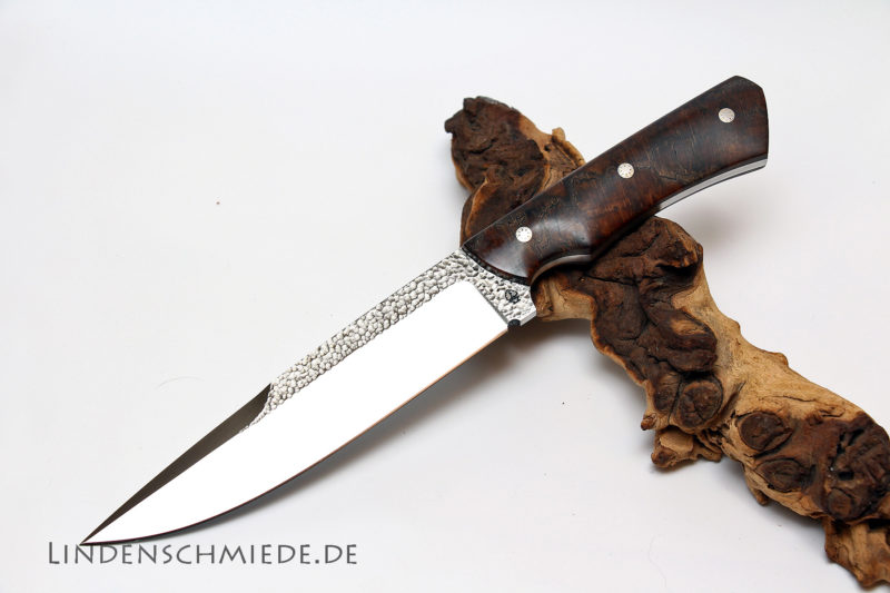 Trotzdem lassen sich Klingen aus dem D2 sehr scharf schleifen und haben gleichzeitig eine sehr gute Schnitthaltigkeit. Mit einem Chromgehalt von ca. 12 – 13% zählt er praktisch schon zu den rostbeständigen Stählen. Fein geschliffen und satiniert kann man im Stahl das Gefüge recht gut erkennen. Es erinnert an eine Wootzstruktur (Tiegeldamast).