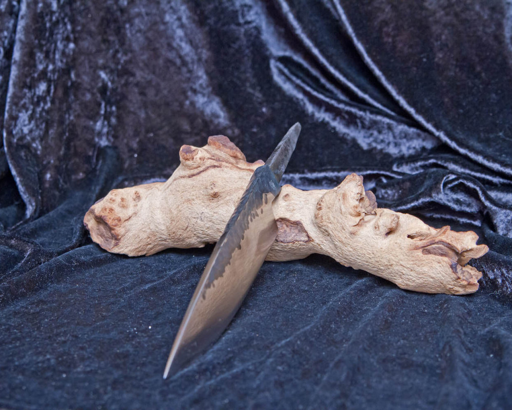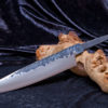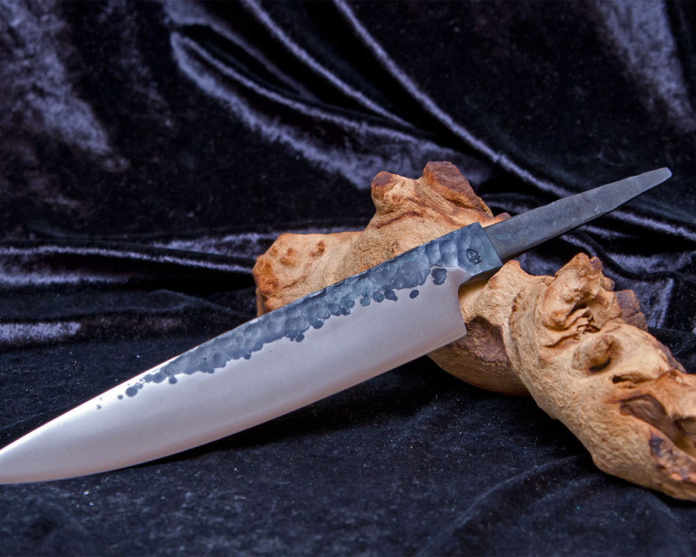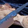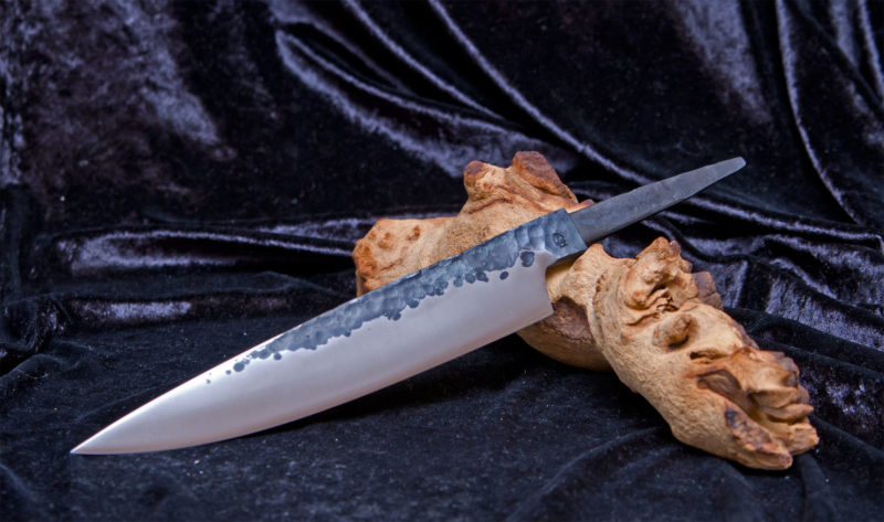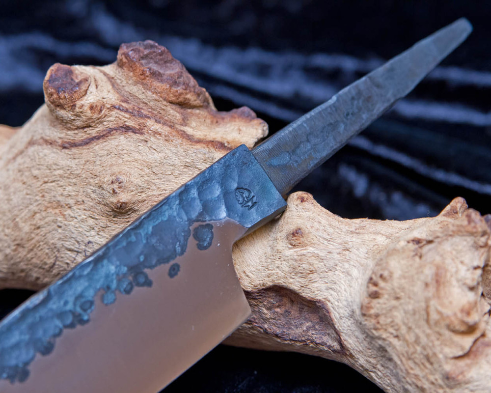 Ich habe die Klinge aus 8mm starkem Material herausgeschmiedet. Die Schmiedestruktur auf dem Rücken und an den Flanken betont die Handarbeit. Durch die schlanke Form und den balligen Schliff eignet sich die Klinge besonders für den Bau eines Fleisch, oder Schinkenmesses.